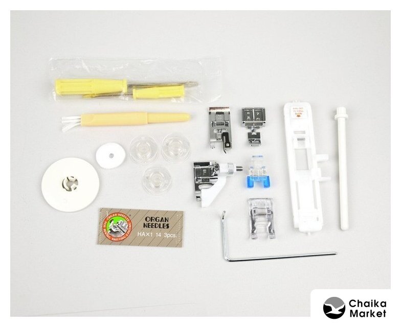 Комплектация | комплект игл, шпулька (3 шт.), педаль, отвертка (2 шт.), щеточка, стержень для второй катушки, сетевой шнур, направляющая для выстегивания, фетровая подушечка для катушки, вспарыватель, подсветка рабочей зоны, отвертка-ключ, держатель катушки |
