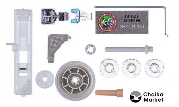 | Комплектация | комплект игл (3 шт. Organ), шпулька (3 шт.), педаль, щеточка, фетровая прокладка, стержень для катушки, сетевой шнур, направляющая для квилтинга, вспарыватель, подсветка рабочей зоны, отвертка-ключ, держатель катушки (2 шт.) |