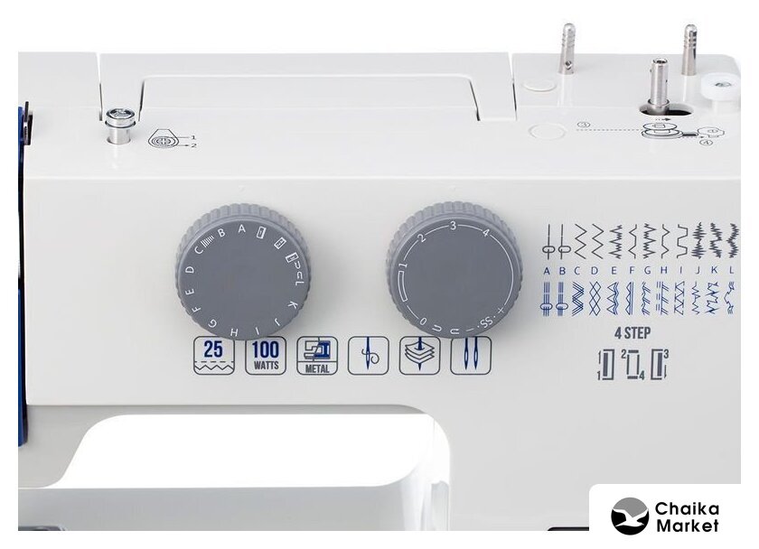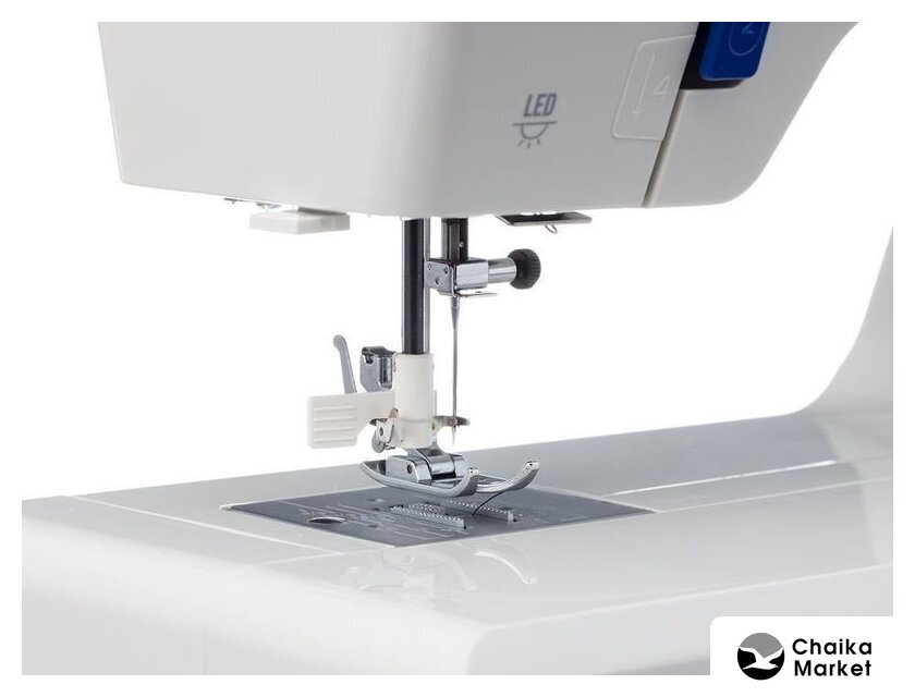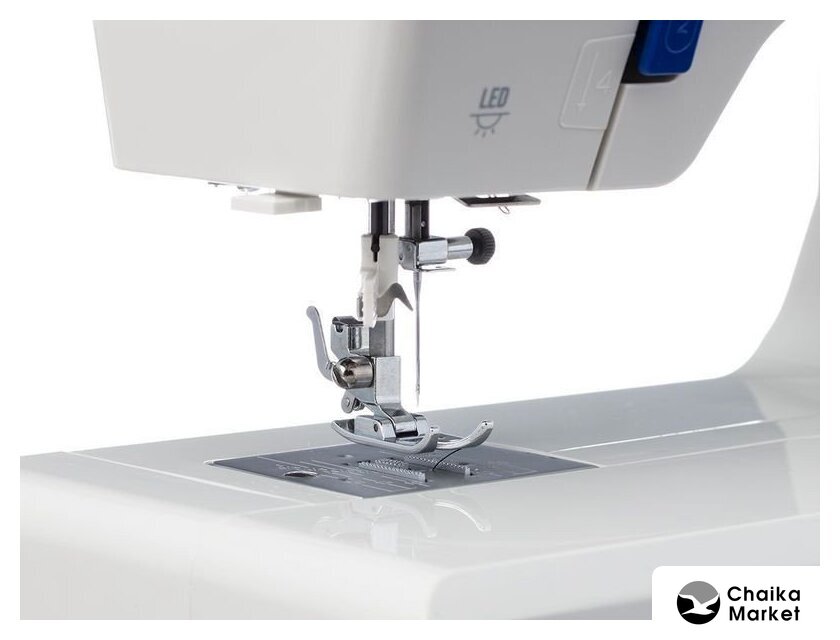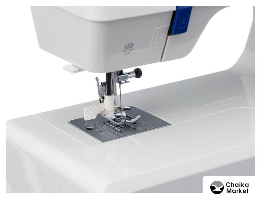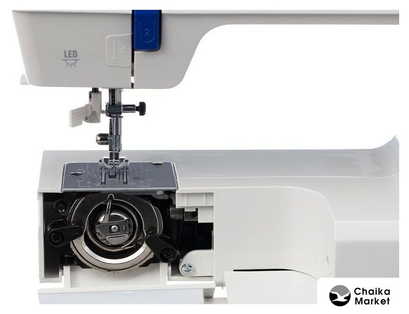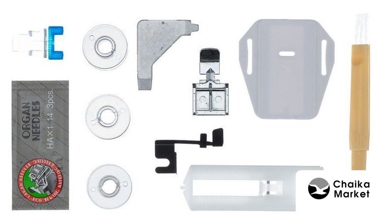 Комплектация | Отвёртка-ключШтопальная пластинаВспарыватель/щёточка для чисткиРасширительный столикМягкий чехолПедальУниверсальная лапкаРамка для выполнения петлиНаправитель для потайного шваЛапка для молнии двухсторонняяЛапка для пришивания пуговицШпульки — 4 шт. (3 и 1 в машине)Набор игл — 3 шт. |
