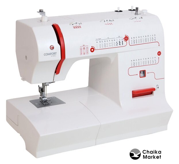электромеханическая, вертикальный качающийся челнок, полуавтоматическое выполнение петли, швейные операции: потайная строчка/трикотажная строчка/декоративная строчка