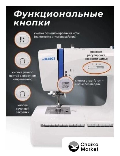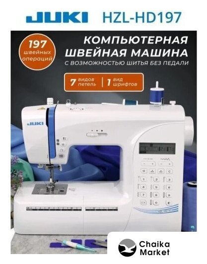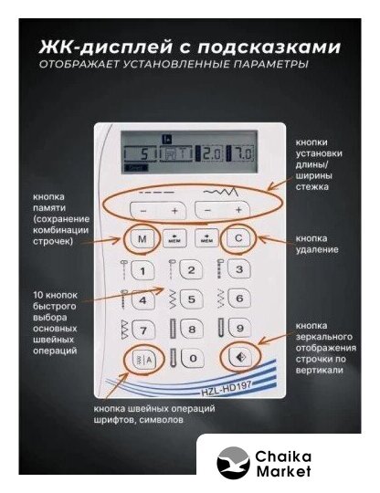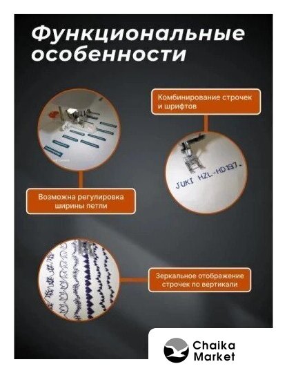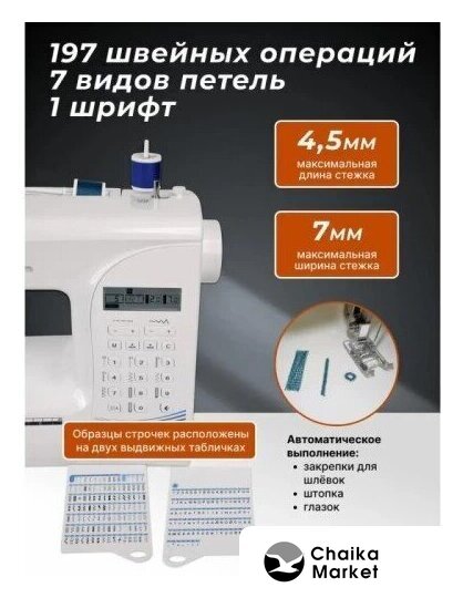 компьютерная, горизонтальный ротационный челнок, автоматическое выполнение петли, швейные операции: имитация оверлочной строчки/потайная строчка/трикотажная строчка/декоративная строчка/алфавит (латиница)/алфавит (кирилица)