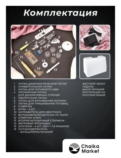 | Комплектация | Шпульки – 4 шт. (3 шт. + 1 в машине)Держатель катушки большой и маленькийФетровая прокладкаОтвёрткаОтвёртка-ключНаправитель для квилтингаВспарыватель/щёточка от пылиВторой катушечный стержень (вертикальный)Жёсткий чехолПедальШнур питанияИнструкция на русском языке |