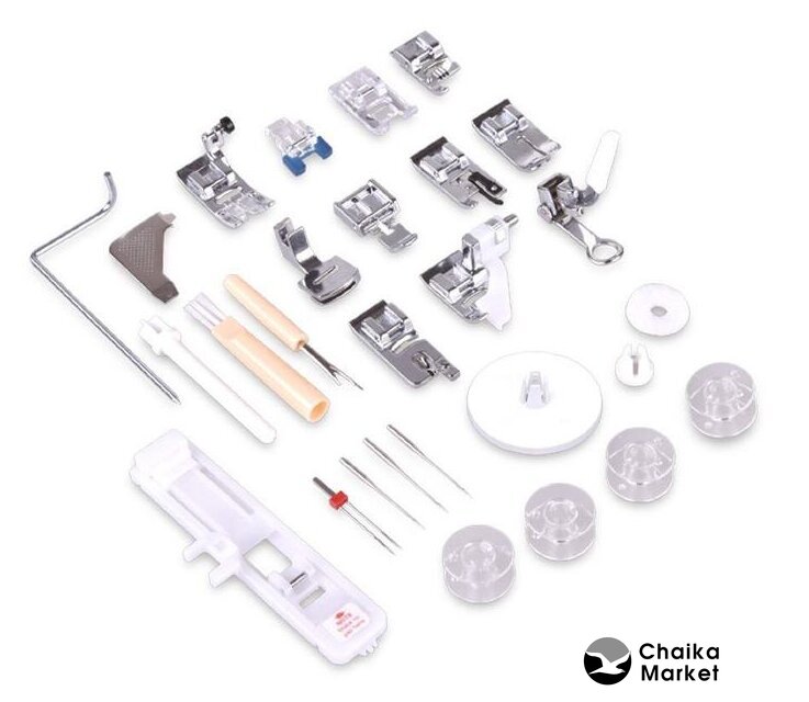 Лапки | универсальная, для вшивания молнии, для обметывания петель, оверлочная, для потайной строчки, для пришивания пуговиц, для потайной подгибки, для декоративных строчек, для вышивания монограмм, для вшивания шнура |