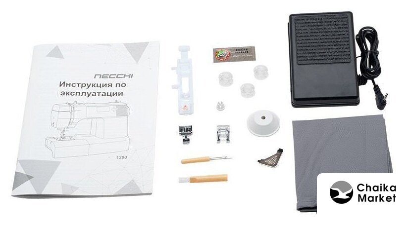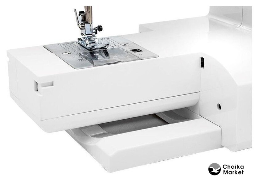 | Комплектация | большой и маленький держатели катушки, вспарыватель шва со щеткой для чистки машины, лапка для атласных строчек, отвертка, запасные иглы, дополнительные шпульки. |