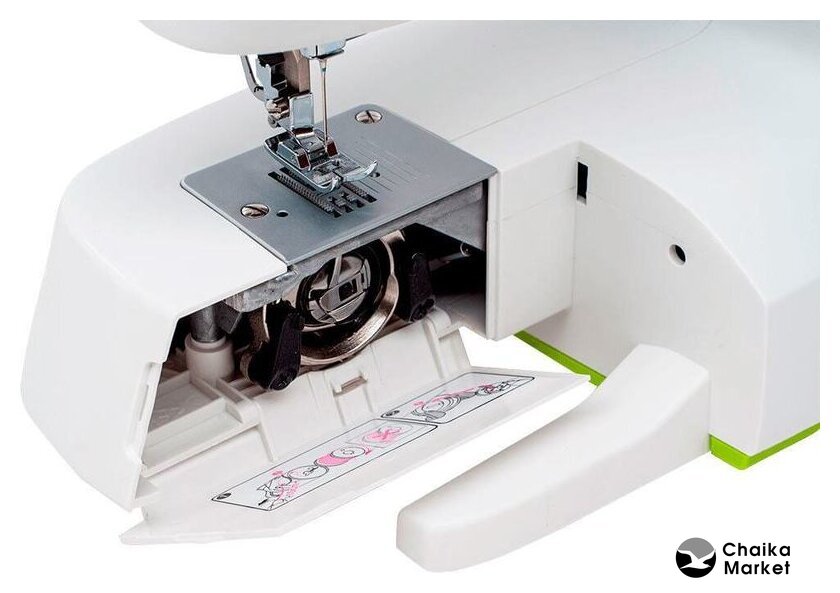электромеханическая, вертикальный качающийся челнок, полуавтоматическое выполнение петли, швейные операции: имитация оверлочной строчки/потайная строчка/трикотажная строчка