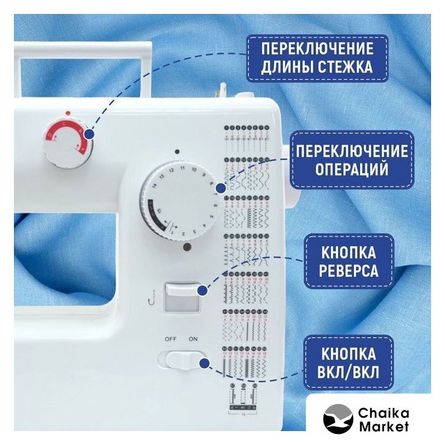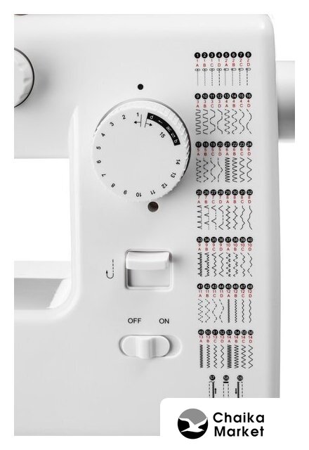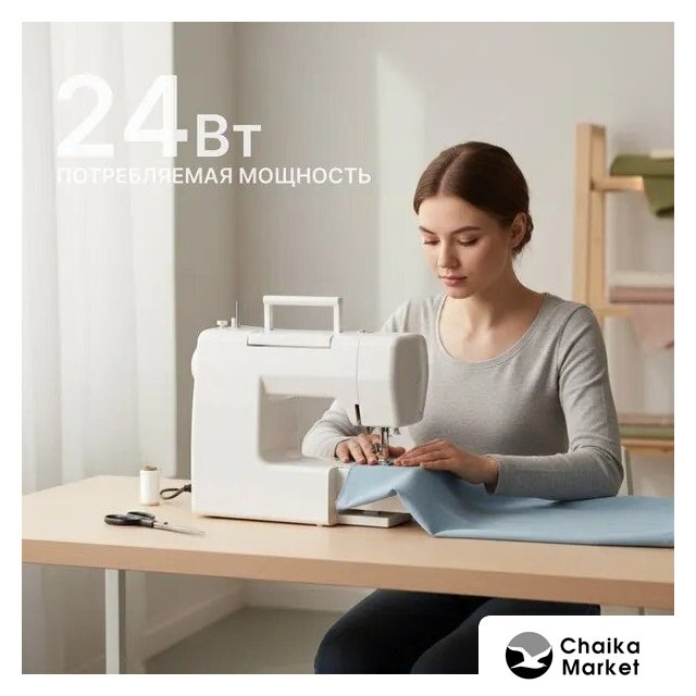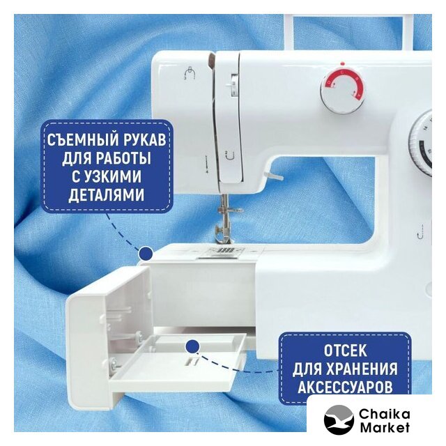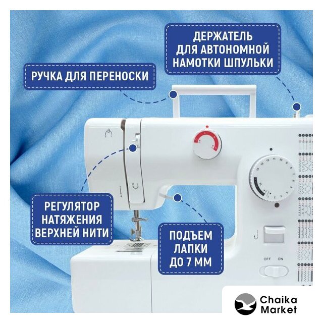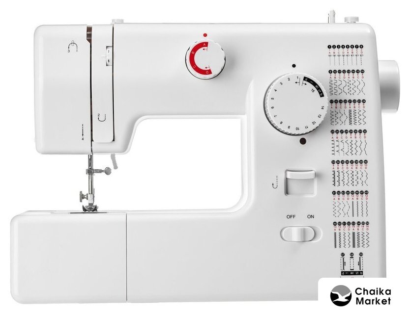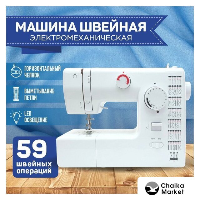 электромеханическая, вертикальный качающийся челнок, полуавтоматическое выполнение петли, швейные операции: имитация оверлочной строчки/потайная строчка/трикотажная строчка/декоративная строчка