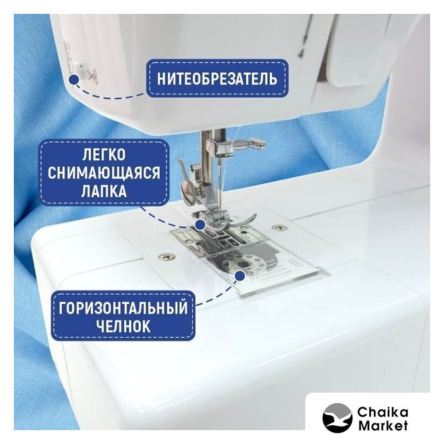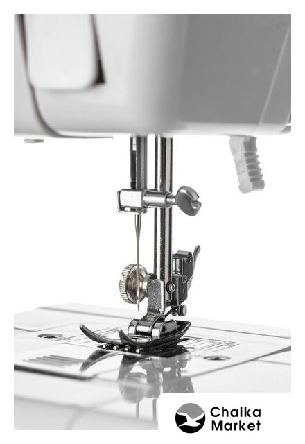 электромеханическая, вертикальный качающийся челнок, полуавтоматическое выполнение петли, швейные операции: имитация оверлочной строчки/потайная строчка/трикотажная строчка