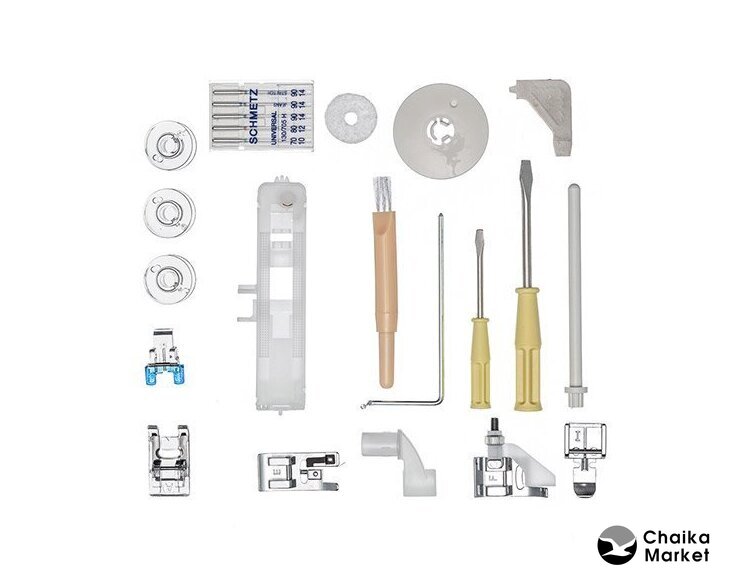 | Комплектация | Направитель для квилтингаНабор ниток и шпулек - по 32 шт.Держатель катушки большойДополнительный катушечный стерженьВспарыватель / щёточка для чисткиНабор игл OrganОтвёртка-ключБольшая отвёрткаМалая отвёрткаФетровая прокладкаПедаль |