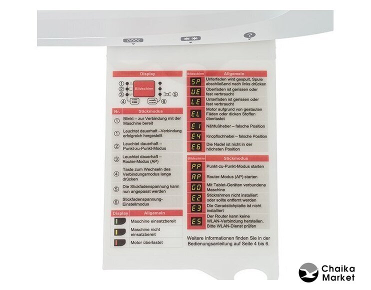 | Комплектация | Направитель для квилтингаЛапка для вышивкиШпулькиДержатель катушки большойДержатель катушки малыйПяльцы (120*180мм)Пяльцы (50*70мм)Дополнительный катушечный стерженьВспарыватель / щёточка для чисткиВышивальная игольная пластинаСетка для катушек нитиНабор игл OrganОтвёртка-ключБольшая отвёрткаМалая отвёрткаФетровая прокладкаПедальБонусный DVD с дополнительными вышивальными дизайнамиНабор вышивальных ниток - 10 шт.Набор вышивальных ниток - 3 шт.Набор стабилизаторов - 4 шт.ПинцетНожницы вышивальныеМягкий чехол |