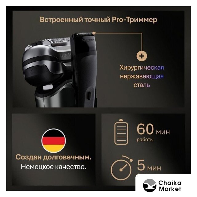 сеточная, влажное бритье, сенсор щетины, питание от аккумулятора, 60 минут автономной работы