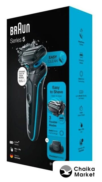 | Комплект поставки | - Электробритва Braun Series 5 51-B1200s Black/Blue;- Зарядное устройство SmartPlug;- Насадка-точный триммер;- Щеточка для чистки. |