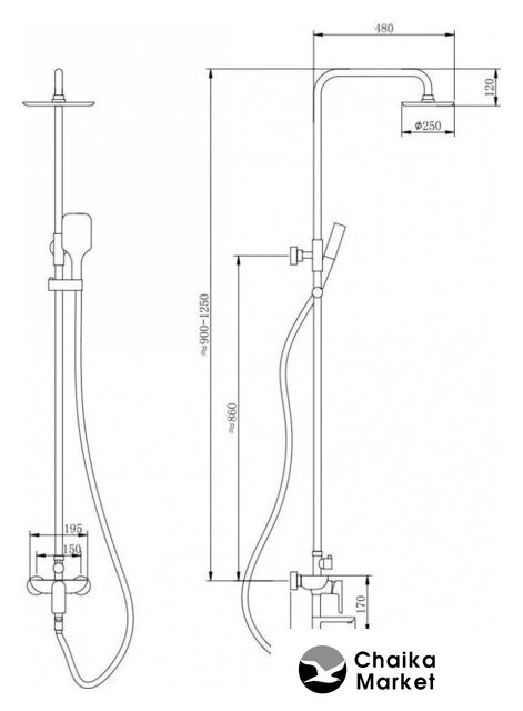 | Диаметр (ширина) верхнего душа | 250 мм |
