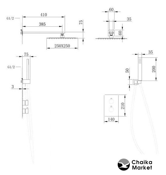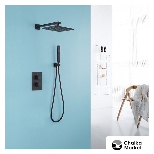 душевая система (с верхним душем), настенный монтаж, термостатический смеситель, верхний душ 250 мм, ручной душ 35 мм