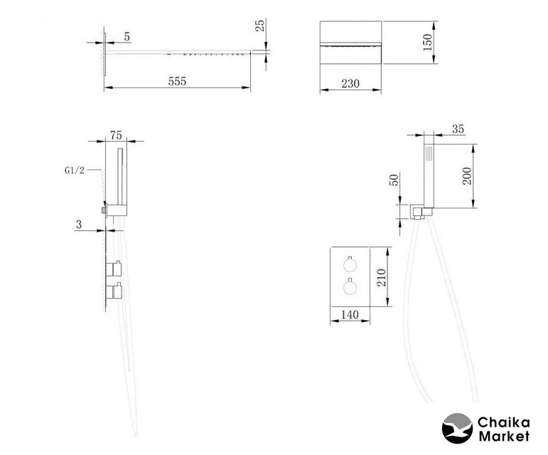 | Комплектация | верхний душ, ручной душ (лейка), держатель лейки, шланг, смеситель |