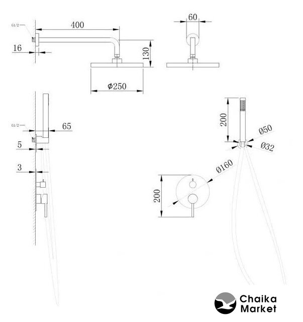 | Диаметр (ширина) верхнего душа | 250 мм |