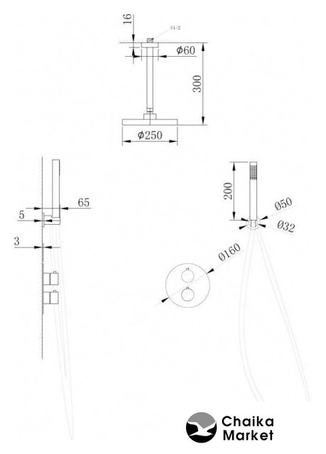 | Диаметр (ширина) верхнего душа | 250 мм |