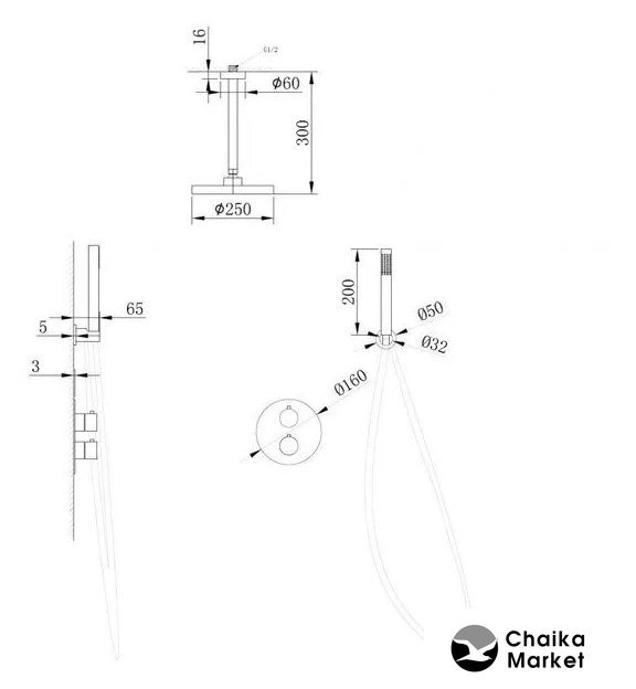 | Диаметр (ширина) верхнего душа | 250 мм |