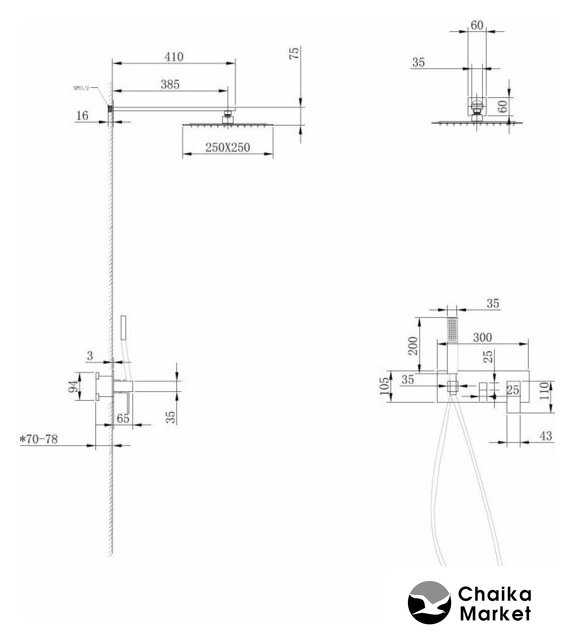 | Диаметр (ширина) верхнего душа | 250 мм |