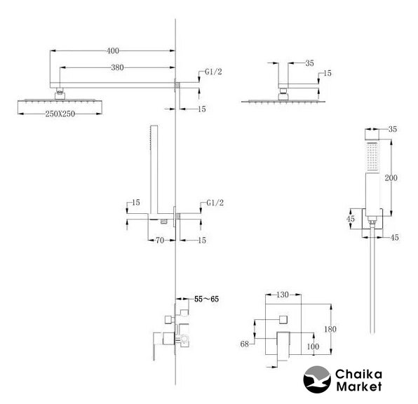 | Комплектация | верхний душ, ручной душ (лейка), держатель лейки, шланг, смеситель |