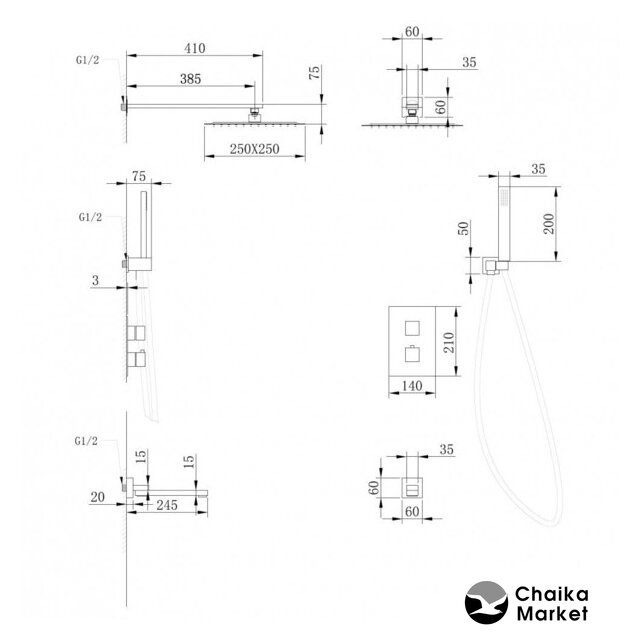 душевая система (с верхним душем), настенный монтаж, термостатический смеситель, верхний душ 250 мм, ручной душ 35 мм