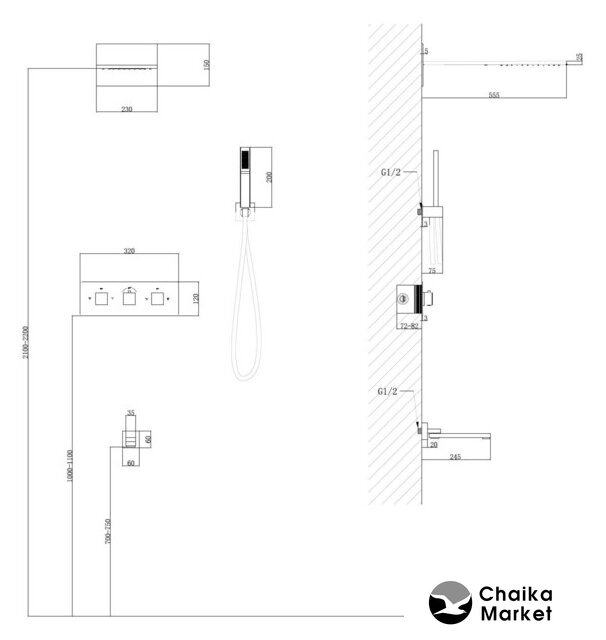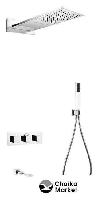 | Комплектация | верхний душ, ручной душ (лейка), держатель лейки, шланг, смеситель, излив для ванны |