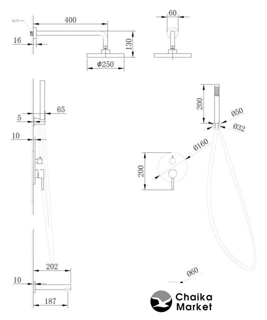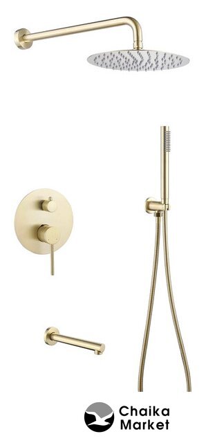 | Комплектация | верхний душ, ручной душ (лейка), держатель лейки, шланг, смеситель, излив для ванны |