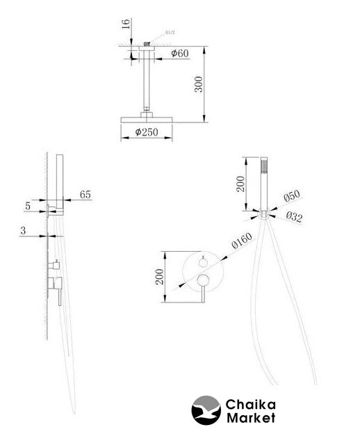 | Диаметр (ширина) верхнего душа | 250 мм |
