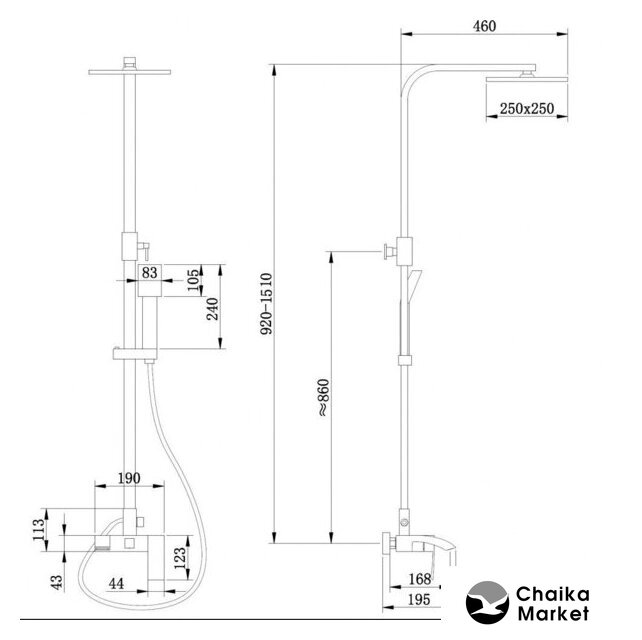 душевая система (254 мм), настенный монтаж, механический смеситель