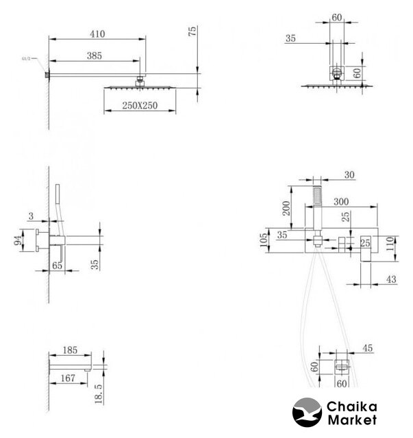 душевая система (с верхним душем), настенный/скрытый монтаж, механический смеситель, верхний душ 250 мм, ручной душ 35 мм