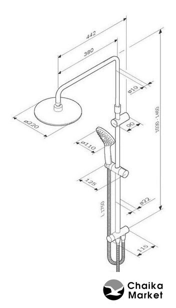 душевая система (с верхним душем), настенный монтаж, механический смеситель, верхний душ 200 мм, ручной душ 955 мм