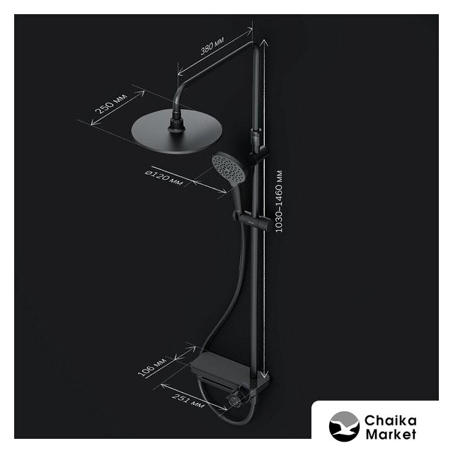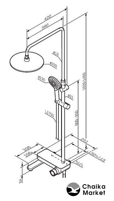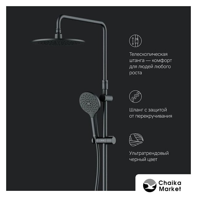 | Комплектация | верхний душ, штанга, ручной душ (лейка), держатель лейки, шланг, смеситель, излив для ванны |