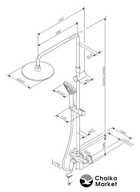 | Диаметр (ширина) верхнего душа | 220 мм |