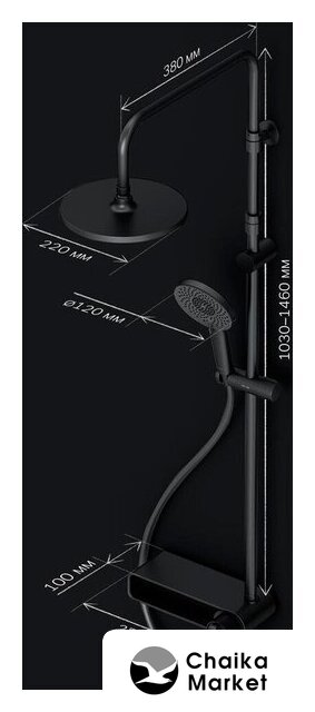 | Комплектация | верхний душ, штанга, ручной душ (лейка), держатель лейки, шланг, смеситель, излив для ванны, полочка |