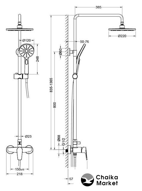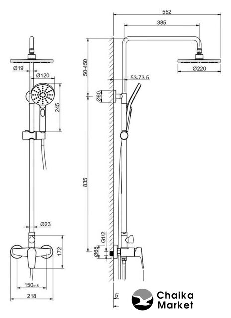 | Диаметр (ширина) верхнего душа | 220 мм |