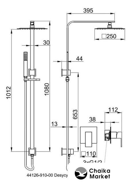 душевая система (с верхним душем), настенный монтаж, механический смеситель, верхний душ 250 мм, ручной душ 117 мм