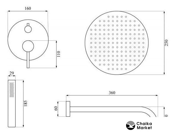 | Диаметр (ширина) верхнего душа | 250 мм |