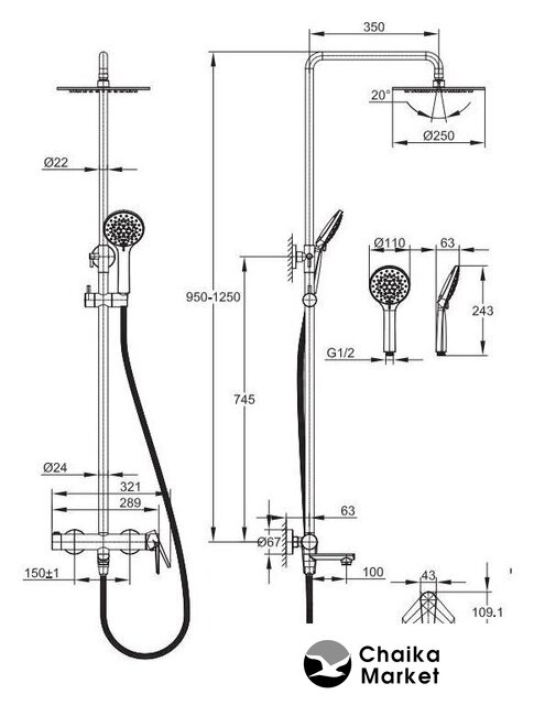 | Комплектация | верхний душ, штанга, ручной душ (лейка), держатель лейки, шланг, смеситель, излив для ванны |
