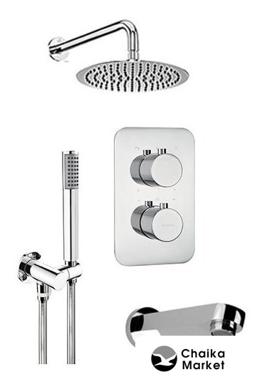 | Комплектация | верхний душ, ручной душ (лейка), держатель лейки, шланг, смеситель, излив для ванны |