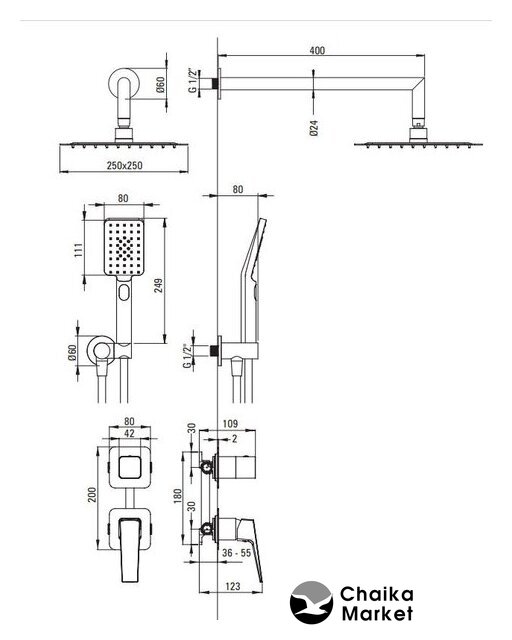 душевая система (с верхним душем), настенный монтаж, механический смеситель, верхний душ 250 мм, ручной душ
