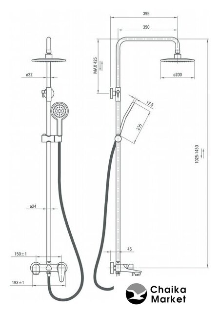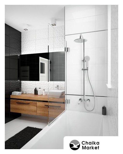 Комплектация | верхний душ, штанга, ручной душ (лейка), держатель лейки, шланг, смеситель, излив для ванны |