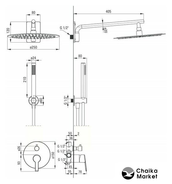 душевая система (с верхним душем), настенный монтаж, механический смеситель, верхний душ 200 мм, ручной душ