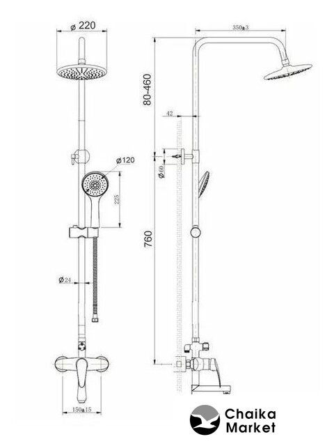 | Комплектация | верхний душ, штанга, держатель лейки, шланг, смеситель |