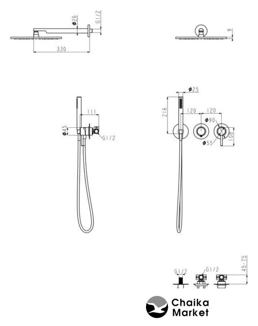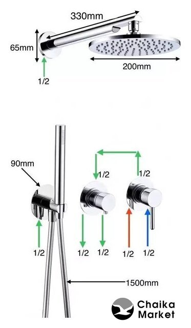 | Комплектация | верхний душ, ручной душ (лейка), шланг |