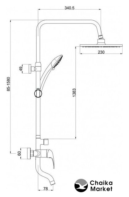 | Комплектация | верхний душ, штанга, ручной душ (лейка), держатель лейки, шланг, смеситель, излив для ванны |