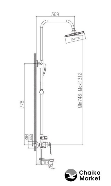 Комплектация | верхний душ, штанга, ручной душ (лейка), держатель лейки, шланг, смеситель, излив для ванны |