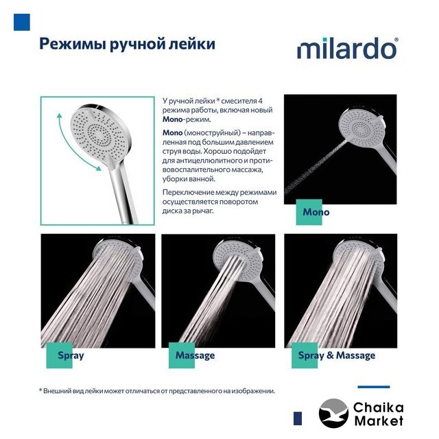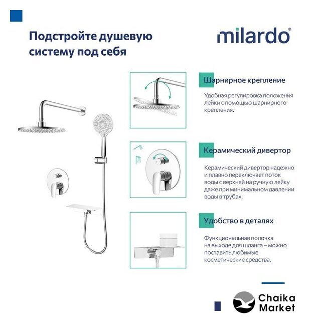 | Комплектация | верхний душ, ручной душ (лейка), держатель лейки, шланг, смеситель |