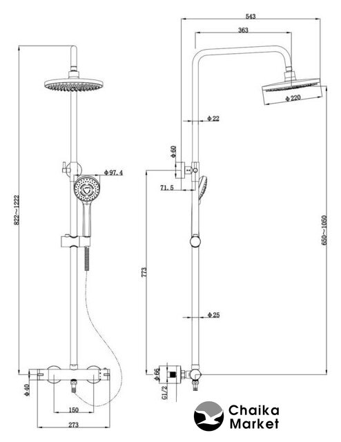 душевая система (с верхним душем), настенный монтаж, механический смеситель, верхний душ 220 мм, ручной душ