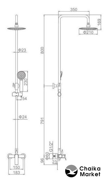| Комплектация | верхний душ, штанга, ручной душ (лейка), держатель лейки, шланг, смеситель |