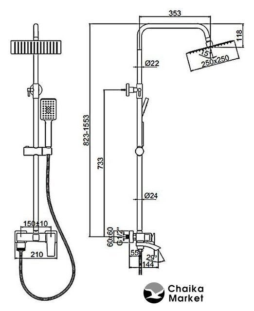 | Диаметр (ширина) верхнего душа | 250 мм |
