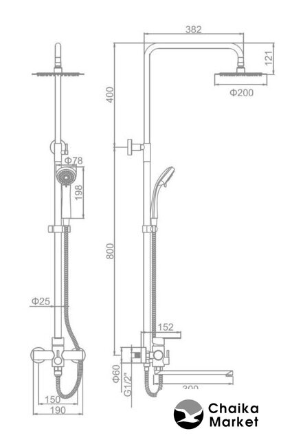 душевая система (с верхним душем), настенный монтаж, механический смеситель, верхний душ 200 мм, ручной душ